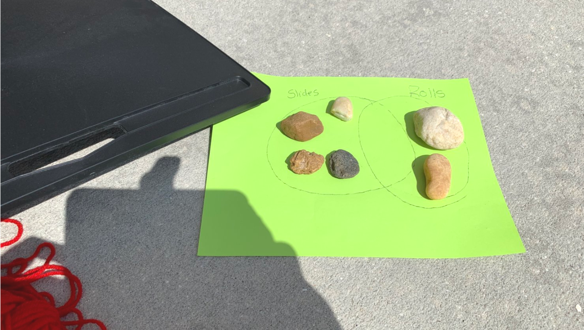 2. The next thing we do is sort rocks by characteristics (a 2nd grade science standard). They quickly realize that many rocks can’t roll, just like Ricky. They see that if a rock has a flat side, they tend to slide down but not roll.